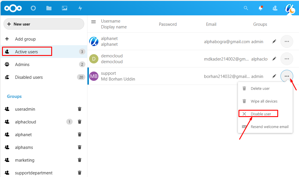Step 4. Navigate to the "Active User" Please Search for the user you want to disable. Disable the account by clicking on the "..." icon.