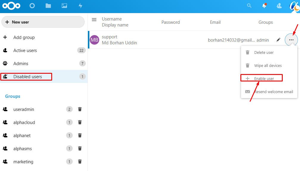 Step 5. Navigate to the "Disabled User" Please Search for the specific user & Enable the account by clicking on the "..." icon.